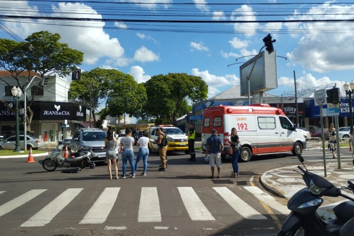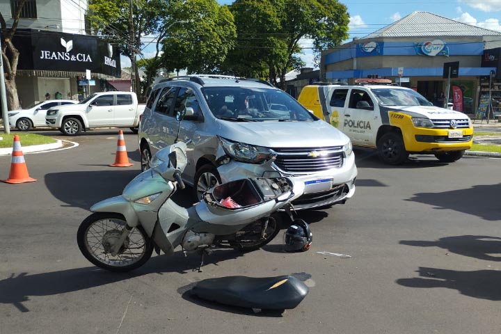 Uma condutora de Honda Biz, de 28 anos, ficou ferida após um acidente envolvendo um automóvel Chevrolet Spin, por volta das 16h desta quarta-feira (14), em um cruzamento da avenida Paraná, em Umuarama.
