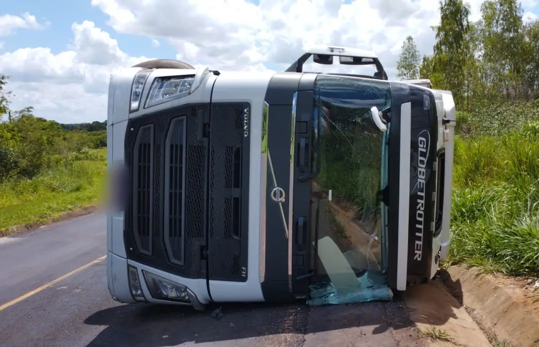 O Volvo/FH 500 e o semirreboque têm placas Pinhalzinho/SC. O condutor é um homem de 47 anos, que teve ferimentos leves.