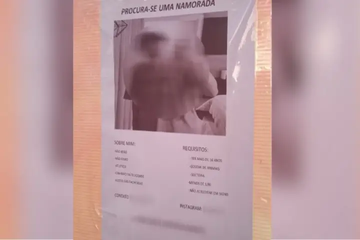 O anúncio diz ainda que a pretendente precisa ter acima de 16 anos, gostar de animais, ser solteira, ter menos de 1,90 e não acreditar em signo. No papel está o contato do rapaz e também o Instagram para as interessadas.