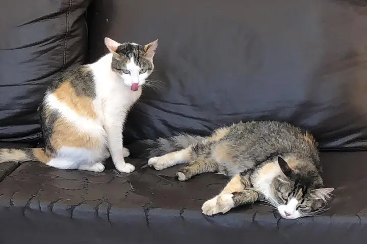 A tutora disse que a gata com três cores, sem raça definida, se chama Ramona. A Pandora é uma gata peluda, inclusive com o rabo bem peludo e com pelagem das patas traseiras de cores diferentes (uma branca e outra preta), também sem raça definida.