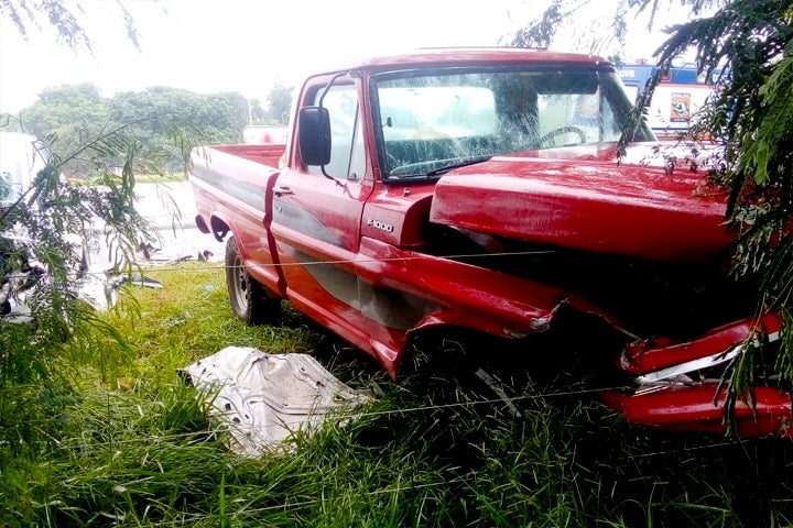 O acidente aconteceu por volta das 13h30 em frente a vila rural de Cruzeiro do Oeste. Os veículos são um VW/Fox branco e uma caminhonete Ford F1000 vermelha.