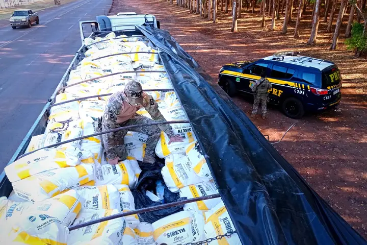 O condutor afirmou ter carregado o ilícito em Foz do Iguaçu/PR, e que teria ainda utilizando-se do carregamento de farinha para encobrir a droga e dificultar a fiscalização.