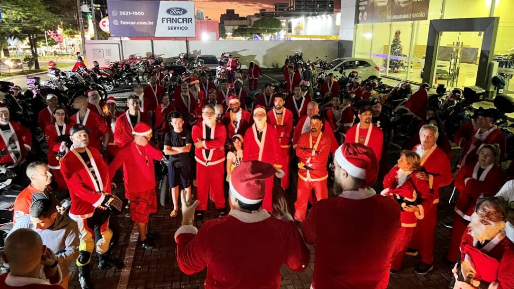 Com gorros vermelhos por cima dos capacetes, dezenas de papais noéis motociclistas chamaram a atenção na noite desta terça-feira (20), na área central de Umuarama. O penúltimo atrativo do cronograma coordenado pela Associação Comercial, Industrial e Agrícola de Umuarama (Aciu) reeditou o sucesso de 2019.