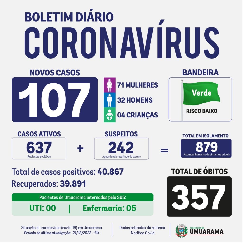 Os novos casos de covid-19 continuam aumentando em Umuarama. Segundo o Boletim Covid desta quarta-feira (21), são mais 107 – 71 mulheres, 32 homens e quatro crianças, todas meninas: uma de três anos, que tomou uma dose da vacina, uma de oito anos, que não foi imunizada, uma de nove e outra de 11 anos, ambas tomaram duas doses de vacina.