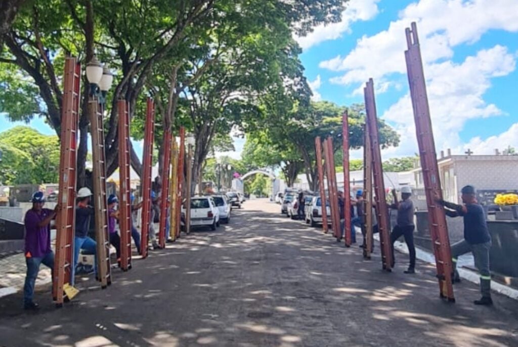 Os profissionais levaram suas escadas para o cemitério e acompanharam a passagem do caixão
