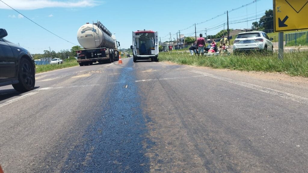 Conforme informações coletadas no local, o motociclista não viu o óleo na pista, escorregou e caiu no asfalto. Ele e a moto acabaram parando na grama.
