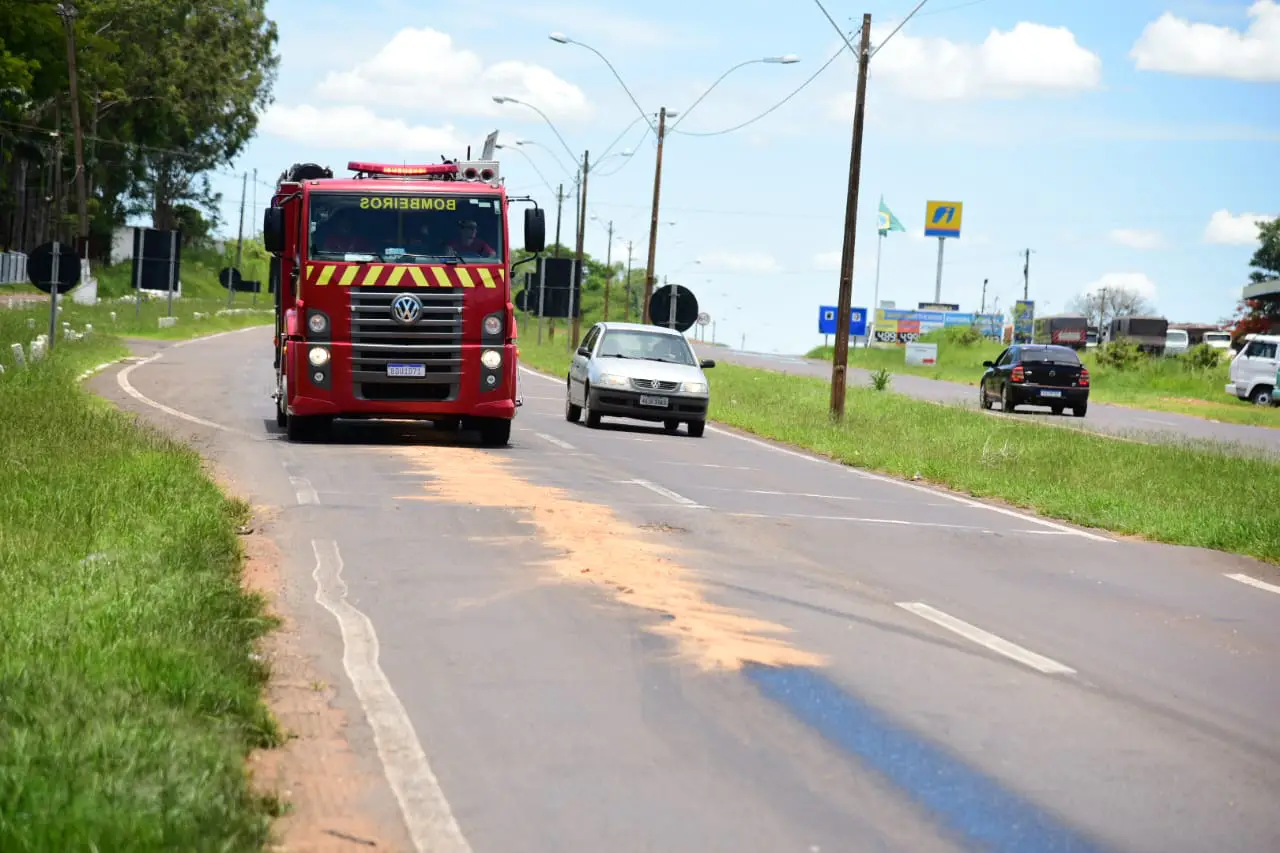 O Corpo de Bombeiros colocou pó de serra em uma mancha de óleo na rodovia PR-323, no perímetro urbano de Umuarama. A medida foi necessária após um acidente ser registrado no trecho, em frente a obra do centro de eventos, perto do parque de exposições.
