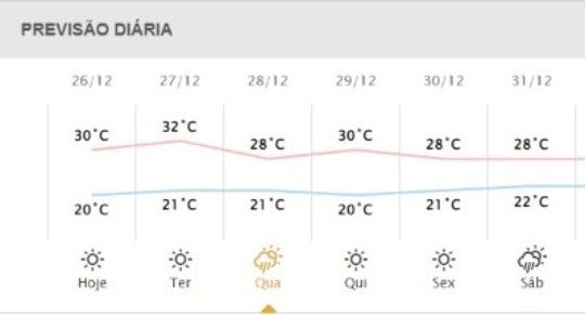 Entretanto, a chuva volta na quarta (28), porém sem muita intensidade devido à precipitação acumulada ser prevista em somente 9.8mm. Os termômetros devem se manter entre 21°C e 28°C neste dia.
