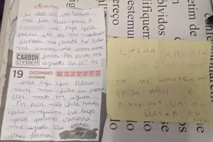 A denúncia foi feita por uma pessoa que encontrou dois bilhetes escritos pela vítima, nos quais ela pedia socorro. “Por favor me ajuda. Se você ler essa mensagem, liga para a polícia. Nem meu filho posso ver mais. Socorro, só achei essa forma”, dizia um dos bilhetes, que foram jogados na rua por uma pequena janela.