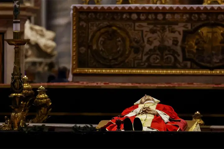 Devem passar pelo local mais de 35 mil devotos. Vestido com paramentos litúrgicos vermelhos e dourados, o corpo de Bento XVI foi colocado em um estrado simples, com dois guardas suíços de pé de cada lado.