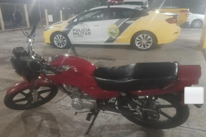A Polícia Militar apreendeu uma motocicleta Honda/CG 125, de cor vermelha, na noite desta quarta-feira (04), na Praça Arthur Tomaz, Zona I, em Umuarama.