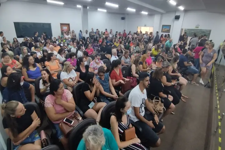 Servidores Públicos Municipais de Umuarama lotam as dependências da Câmara de Vereadores, nesta tarde de segunda-feira (09), para acompanhar a discussão e votação do Projeto de Lei Complementar da reforma da previdência municipal.