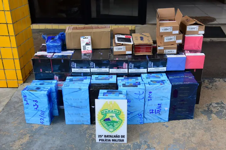 Ao todo foram recuperados 3 Power Bank Redmi, 110 Pods descartáveis Elf Bar, 50 SSD Kingston 240 Gb, 10 SSD SanDisk 240 Gb, 100 Micro SD San Disk 32 Gb, 10 Samsung A03, 10 Redmi Note 11S, 10 Poco X4 Pro, e 35 Redmi Note 11.