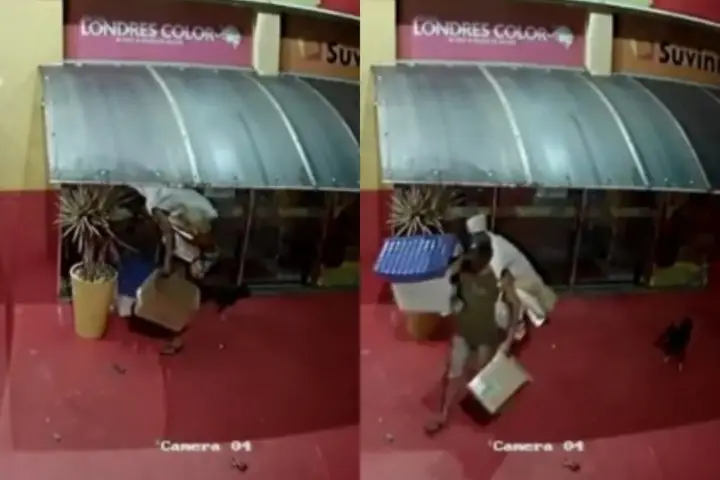 No vídeo, compartilhado pelo gerente do estabelecimento – assista abaixo – é possível ver o suspeito passando em frente à loja, quando, ao perceber o cachorro dormindo dentro do abrigo, expulsa o animal e foge levando a casinha nas mãos.