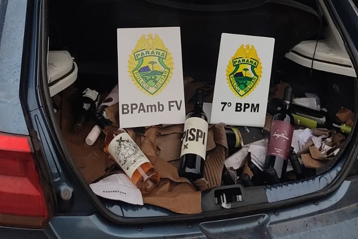 Um condutor que transportava 212 garrafas de vinho argentino foi detido pela Polícia Ambiental de Umuarama (PMAmb), na madrugada desta terça-feira (31), após capotar o veículo e cair com ele dentro de um rio na PR-180, em Goioerê.