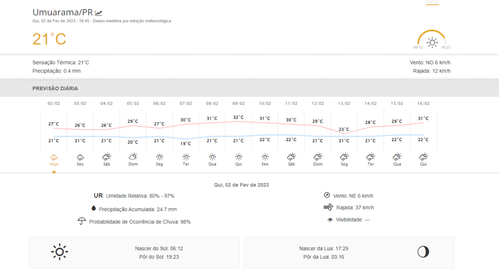 Segundo o Sistema de Tecnologia e Monitoramento Ambiental do Paraná (Simepar), a previsão para Umuarama é de 24,7 milímetros para esta quinta-feira. Segundo o órgão, o tempo deve permanecer instável na capital do Noroeste até sábado (4). Até lá são esperados pelo menos 43,5 milímetros de chuvas.