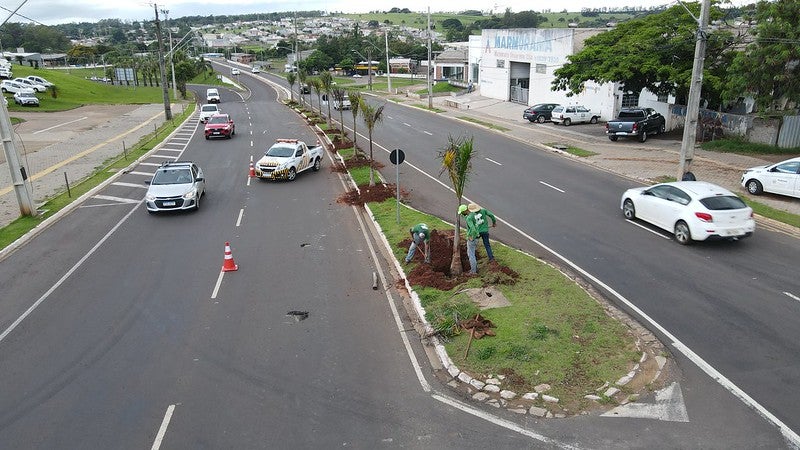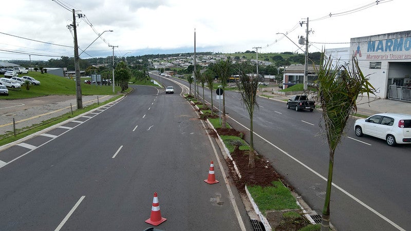 Um trecho da avenida Tiradentes, entre a avenida Castelo Branco e a saída para a rodovia PR-323, foi revitalizado. E agora a Secretaria Municipal de Meio Ambiente finaliza a obra com o plantio de 127 palmeiras imperiais.