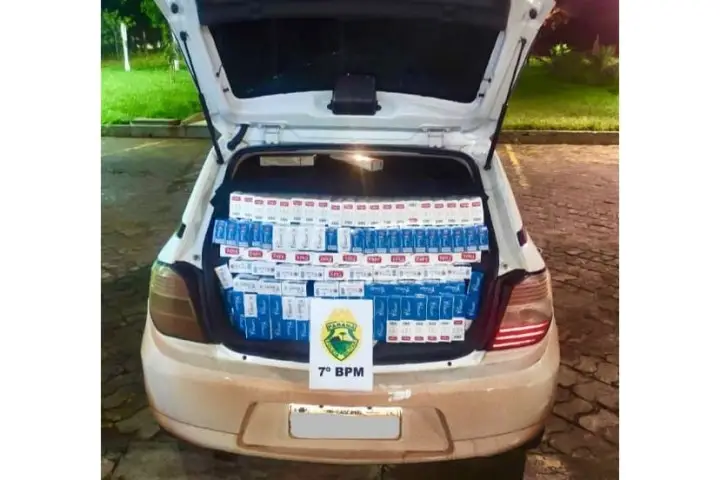 Policiais do 7º Batalhão de Polícia Militar (BPM) apreenderam, na madrugada desta sexta-feira (3), um carro que transportava 25 caixas de cigarros contrabandeados do Paraguai durante uma abordagem na região central do município