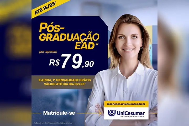 Quando o assunto é ensino de qualidade, a Unicesumar é referência em Umuarama e também em toda a região. A instituição está oferecendo uma campanha incrível para dez cursos de pós-graduação e, por tempo limitado, o aluno pagará apenas R$ 79,90 de mensalidade nestes cursos. Confira abaixo as opções: