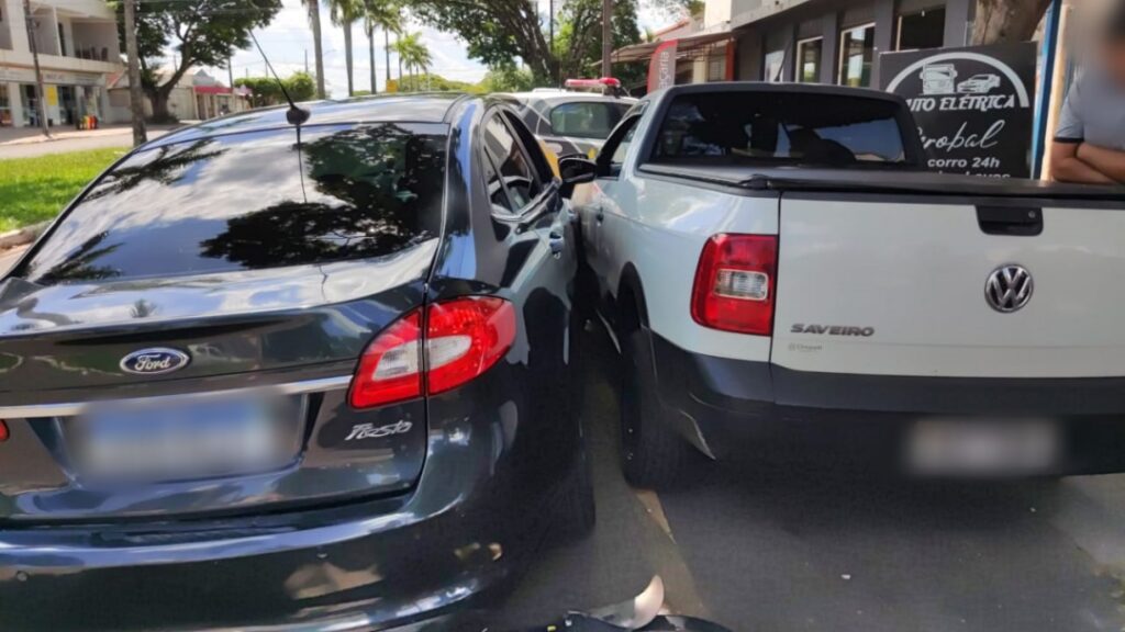 Os dados coletados indicam que o condutor da Strada estava trafegando e não viu o Fiesta parado na avenida. Ele acabou colidindo e o Fiesta atingiu a Saveiro estacionada.