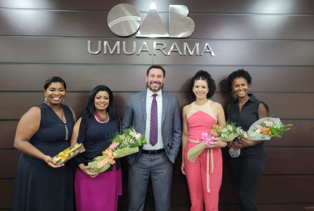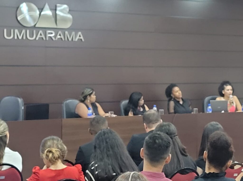 Compondo a mesa estavam Christhian Pellacani (presidente da OAB Umuarama), Manuela de Carvalho Marques Gaspareto (presidente da comissão de igualdade racial e social da OAB Umuarama), e as palestrantes Josiane Barbosa Gouvêa, Ivanete Aparecida da Silva e Michele de Carvalho Marques Sousa.