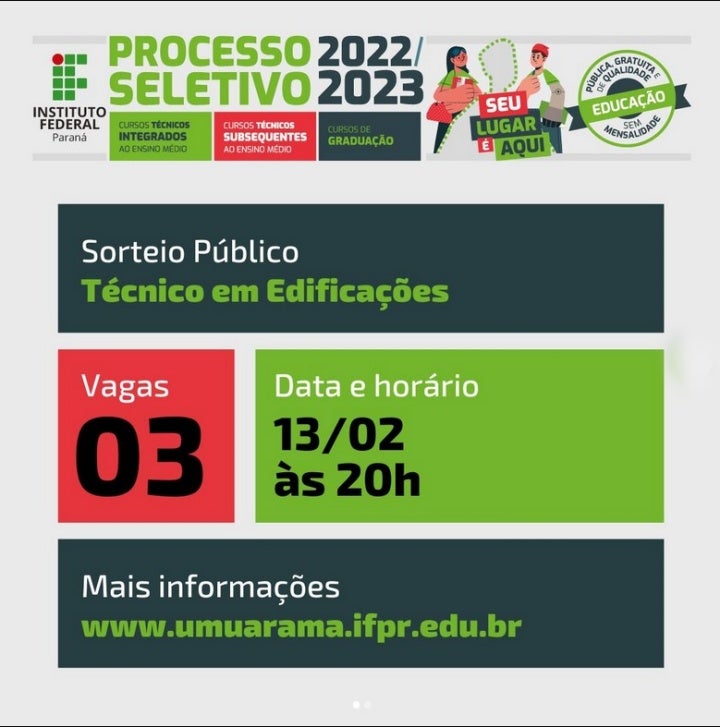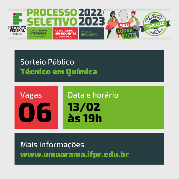 O IFPR Umuarama fará o sorteio público de vagas remanescentes do Processo Seletivo 2023. No campus local são 9 vagas a serem sorteadas: 6 para o curso de Técnico em Química e 3 para Técnico em Edificações.
