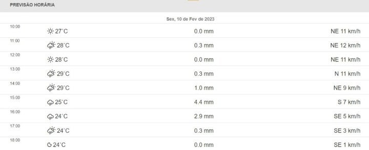 O instituto também prevê ocorrências de chuva durante praticamente o período da tarde, entre as 13h e 17h, ocorrendo com mais intensidade por volta das 15h. Também não se descarta pancadas de chuva já no período do fim da manhã, próximo das 11h.
