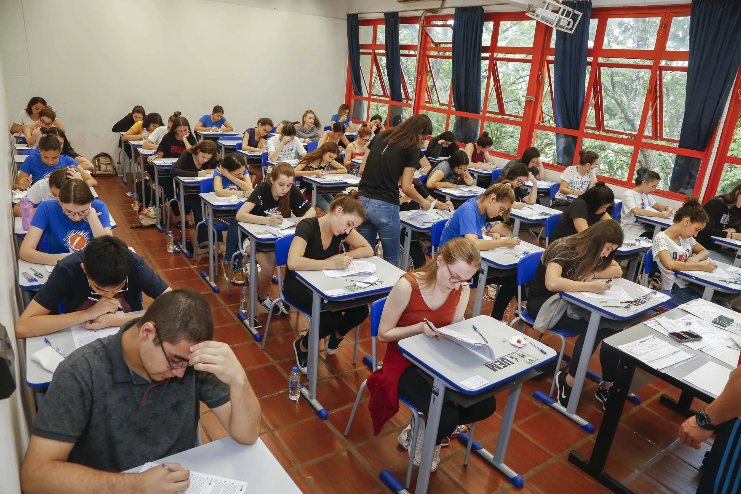 Os candidatos terão 5 horas para escrever uma redação e responder 50 questões objetivas de múltiplas escolhas. Após o início do exame, às 14h, o candidato deverá aguardar, pelo menos, 3 horas para entregar todo o material de prova e retirar-se da sala. Somente serão aceitas folhas de respostas preenchidas com caneta esferográfica de tinta azul-escuro e corpo transparente.