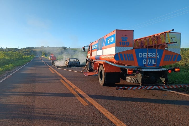 Um Corsa Wind acabou pegando fogo no início da noite deste sábado (11), na PR-490, entre as cidades de Iporã e Altônia.