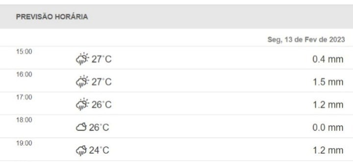Na quarta-feira (15) a chuva promete ser um pouco mais presente, com precipitação acumulada em 18.6mm. Neste dia, a previsão é que os termômetros fiquem entre 23°C e 28°C.