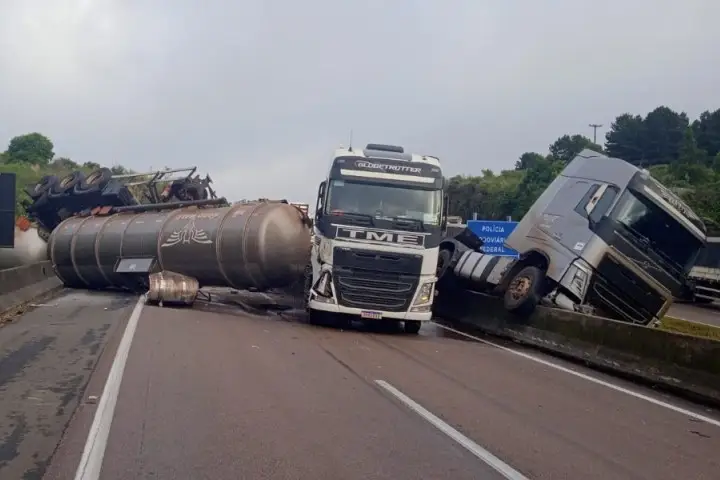 Segundo a PRF, um caminhão com placas de Foz do Iguaçu bateu na lateral de um caminhão-tanque de Uberlândia (MG), que transportava álcool etílico. Após a colisão, o veículo tombou na pista e houve derramamento da carga.
