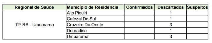 A Regional de Saúde de Umuarama não possui casos confirmados da doença. Na região houve apenas registros de casos suspeitos, que já foram descartados, nas seguintes cidades: Alto Piquiri (1), Cafezal Do Sul (1), Cruzeiro do Oeste (3), Douradina (1) e Umuarama (3).