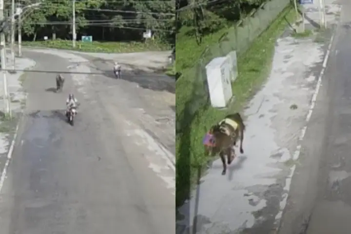 De acordo com a Polícia Militar (PM), o atropelamento aconteceu por volta das 8h, quando a vítima atravessava a rua que fica em frente à sua casa. Nas imagens é possível ver que o animal passa correndo e tromba com violência na vítima, que cai imóvel ao chão.