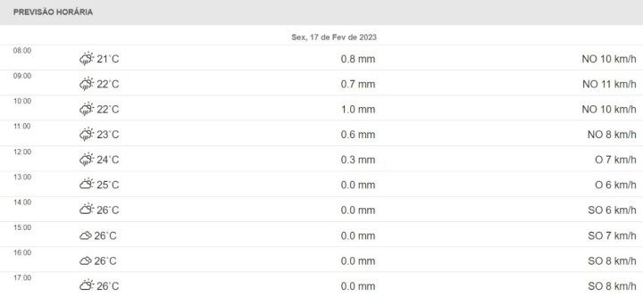 No domingo é previsto sol entre nuvens, sem chuva, e dia com mínima de 20°C e máxima de 26°C.
