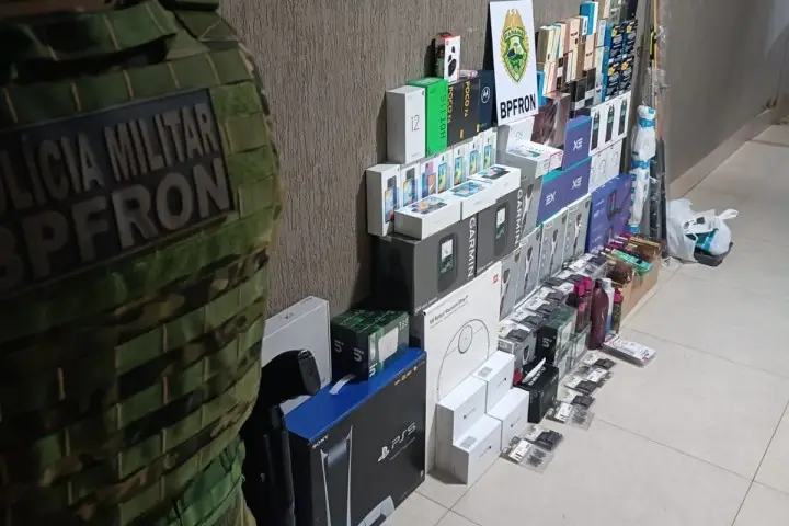 Em revista ao veículo os policiais encontraram vários produtos eletrônicos como celulares, barbeadores, videogames, além de outros produtos como cosméticos e varas de pescar – todos sem o devido trâmite fiscal na aduana.