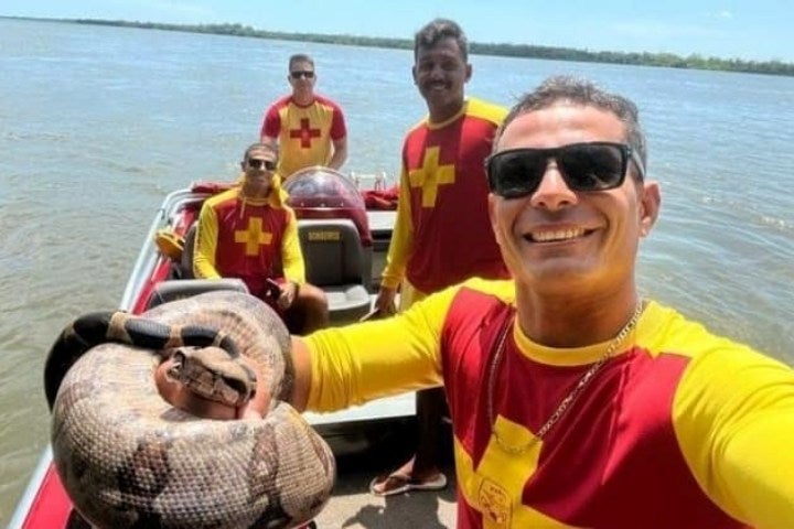 O animal – que é um réptil não peçonhento – foi encontrado pelos guarda-vidas no momento que ela havia acabado de sair da água e seguia por uma rampa náutica, com direção à um estabelecimento da região.