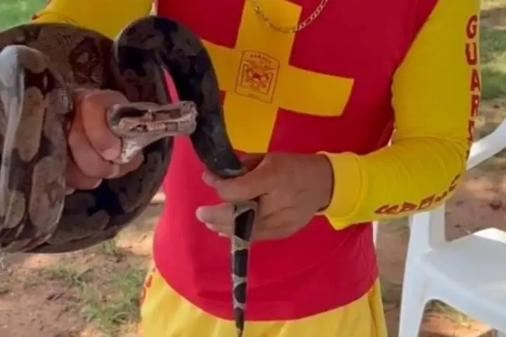 O animal – que é um réptil não peçonhento – foi encontrado pelos guarda-vidas no momento que ela havia acabado de sair da água e seguia por uma rampa náutica, com direção à um estabelecimento da região.