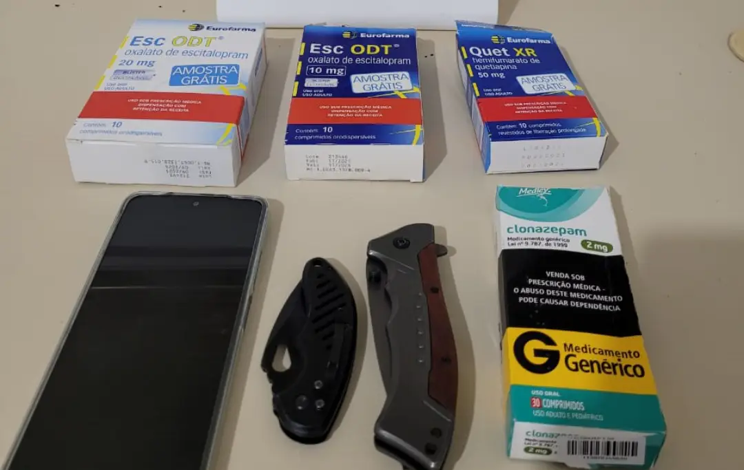 Foram apreendidos os remédios, os canivetes e um aparelho celular da marca Xiaomi, modelo Poco x4, cor azul de propriedade do autor. Conforme a vítima, o autor guarda fotos dela dopada no celular.