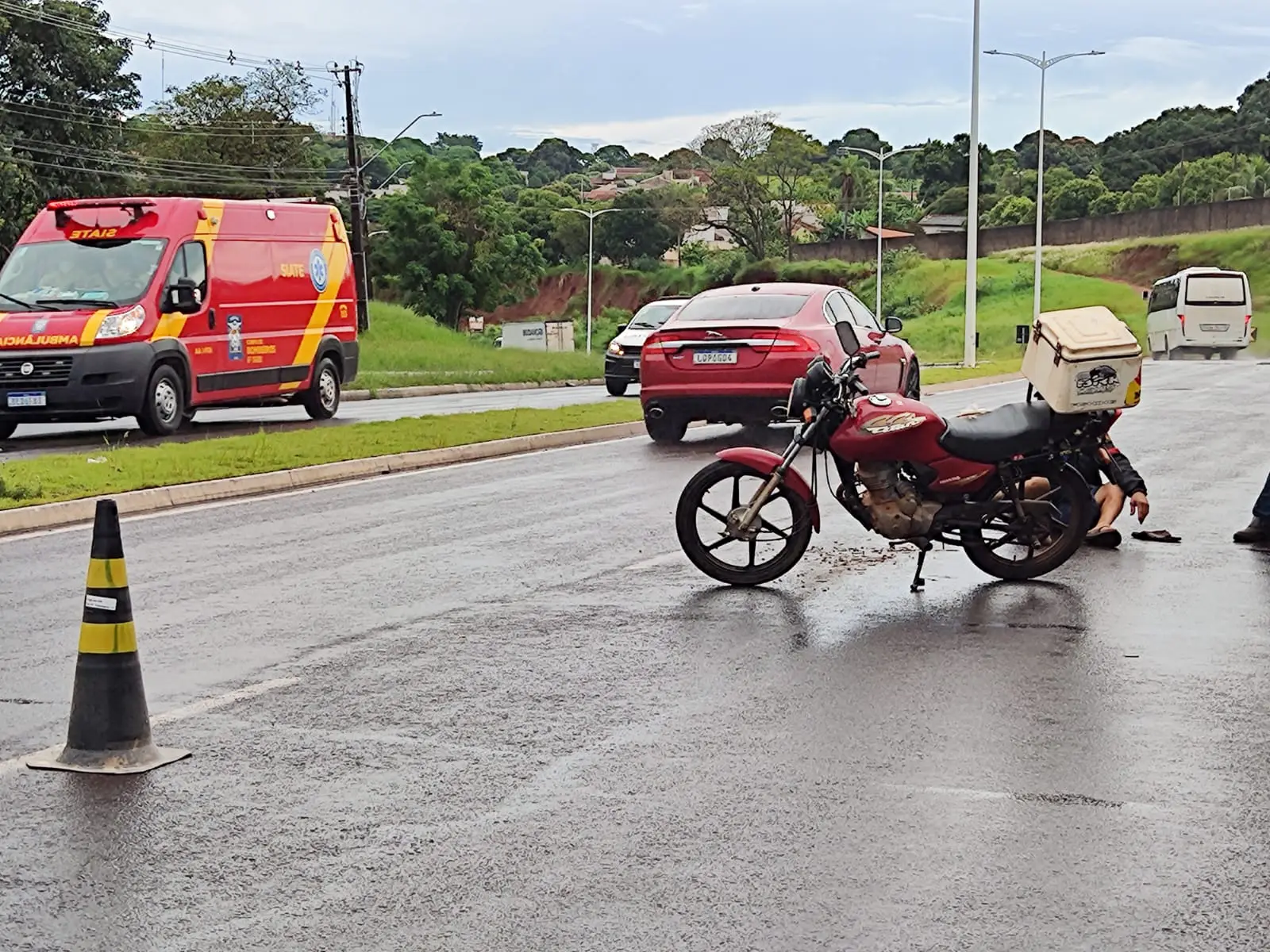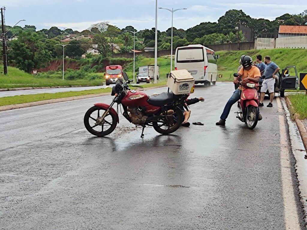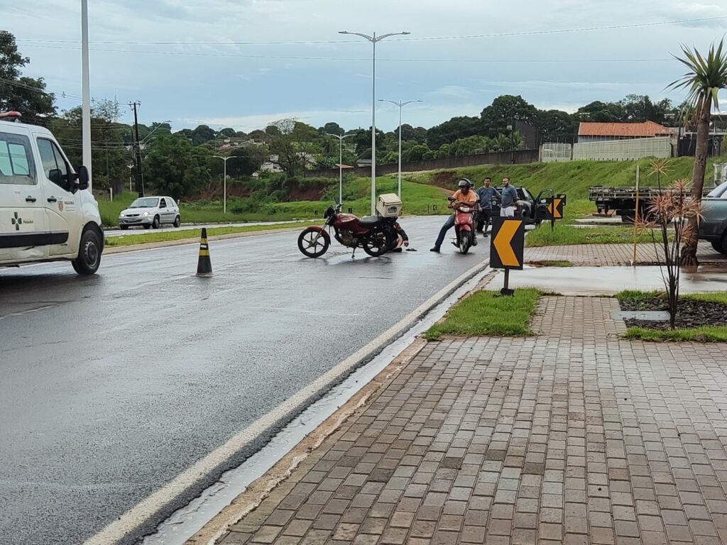 A vítima comentou no local que havia um caminhão sendo manobrado para entrar de ré na garagem de uma empresa. O motociclista disse que precisou frear para não bater no caminhão. Como a pista estava molhada, ele escorregou e caiu.
