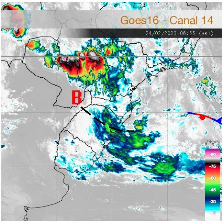 No sábado, a instabilidade atmosférica ainda predomina sobre as regiões paranaenses. Novamente, áreas de instabilidades provocam pancadas de chuvas isoladas, principalmente a partir da tarde. Uma nova frente fria se forma sobre o oceano na altura do Uruguai (Simepar).