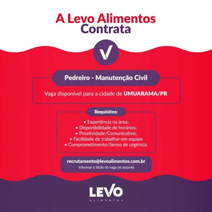 A Levo Alimentos também divulgou que está com uma vaga disponível para Umuarama no cargo de Pedreiro, para Manutenção Civil. Dentre os requisitos é exigido que o profissional possua experiência na área, disponibilidade de horários, seja proativo e comunicativo, saiba trabalhar em equipe e tenha comprometimento e senso de urgência.