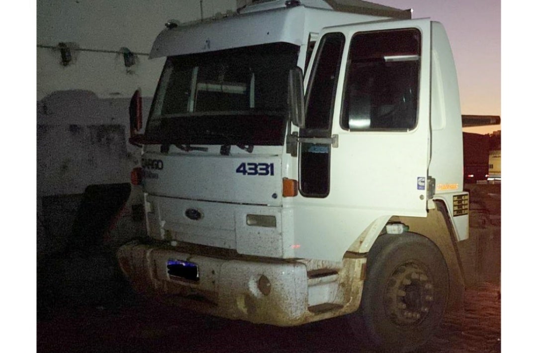 Na sequência foi constatado que o suspeito estava de posse do caminhão trator Ford/Cargo, cor branca, ano 2004, que apresenta registro de apropriação indébita.