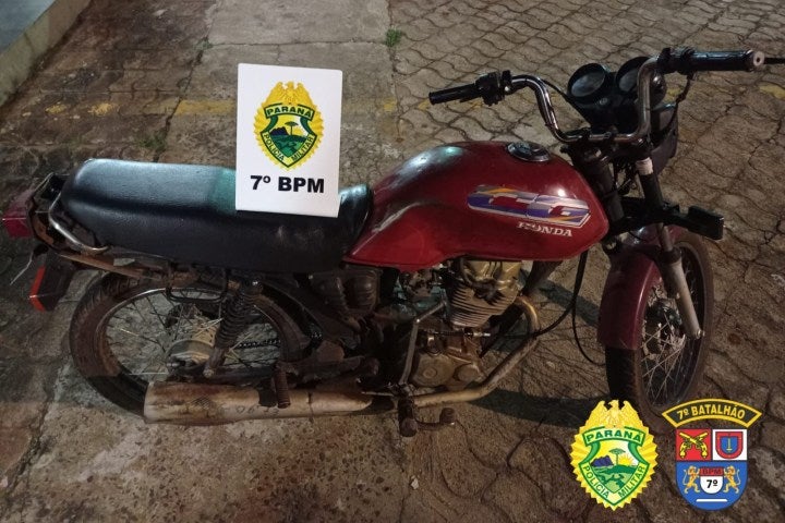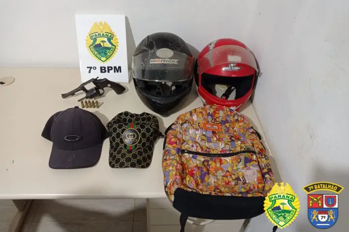 Uma dupla suspeita de participação em um roubo à uma loja de roupas em Goioerê no último sábado (4) foi detida, neste domingo (5) por policiais do 7º Batalhão de Polícia Militar (BPM), após serem flagrados em posse de um revólver calibre .38 com cinco munições e a motocicleta que foi utilizada para o assalto.