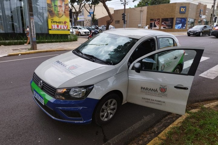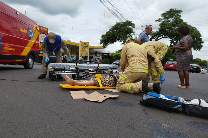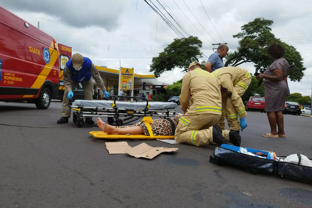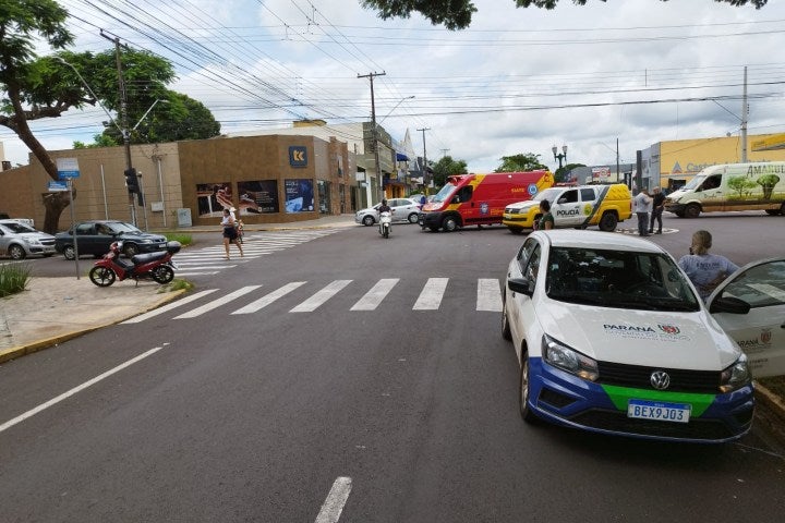 Colisão entre carro da Saúde e Honda Biz deixa mulher ferida em cruzamento de Umuarama