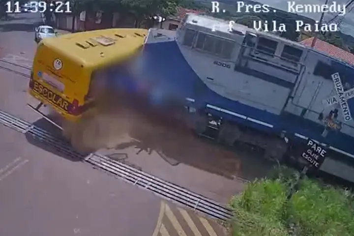 Um vídeo de câmera de monitoramento mostra o momento em que o ônibus da Apae (Associação Pais Amigos Excepcionais) de Jandaia do Sul, no norte do Paraná, foi atingido por um trem. O acidente aconteceu na manhã desta quinta-feira (9). Duas crianças morreram.