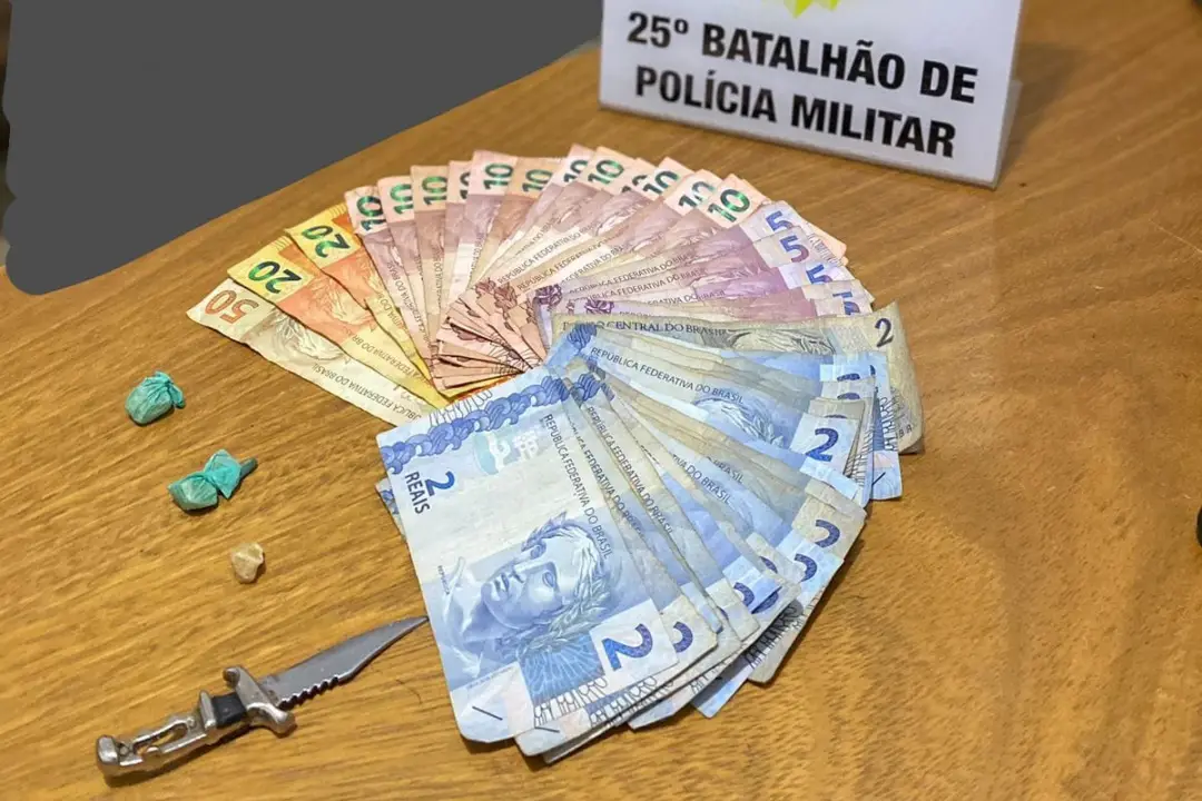 Ao ser questionada se possuía algum ilícito, pois a equipe iria solicitar a presença de uma policial feminina para realizar a revista pessoal, a suspeita cooperou. Ela tirou de seu bolso uma pedra de crack, que não estava embalada, e um canivete pequeno. A mulher também entregou a quantia de R$ 320 em notas trocadas que estava em sua blusa.