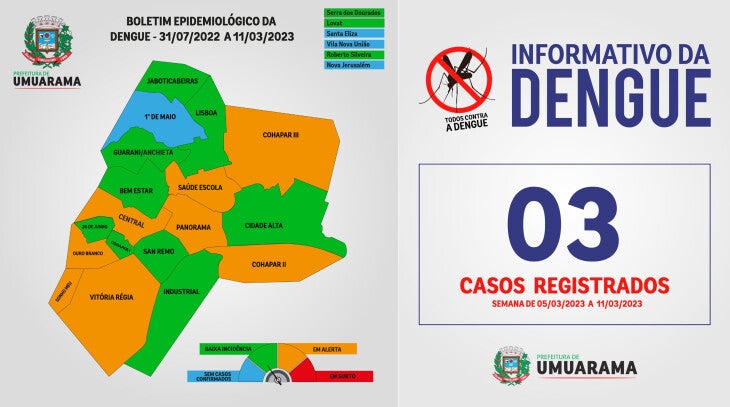 O documento traz ainda a informação de um caso confirmado de febre chikungunya e duas suspeitas em investigação. Ainda com relação à dengue, há 84 suspeitas sendo investigadas por meio de exames e avaliações clínicas e 965 exames tiveram resultado negativo, dentre os 1.156 registros de suspeita da doença.