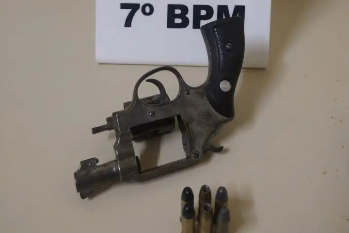 As equipes então conseguiram abordar e render o criminoso que estava em posse de um revólver calibre .38 municiado. Ele recebeu voz de prisão e foi encaminhado para a Delegacia de Polícia Civil, onde também foi entregue a arma e as munições.