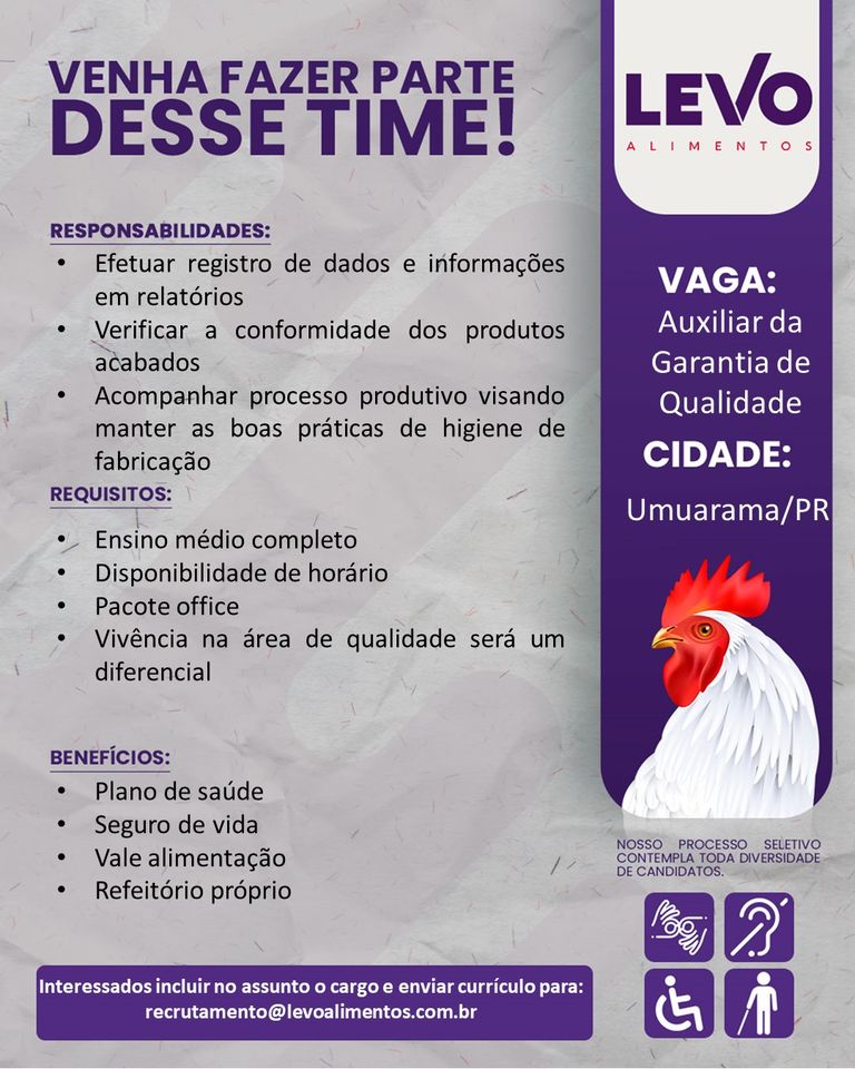 A Levo Alimentos também divulgou que está com uma vaga aberta para o cargo de Auxiliar da Garantia de Qualidade, em Umuarama. Dentre os requisitos é exigido que o profissional possua ensino médio completo, disponibilidade de horário e pacote Office. Vivência na área será um diferencial.