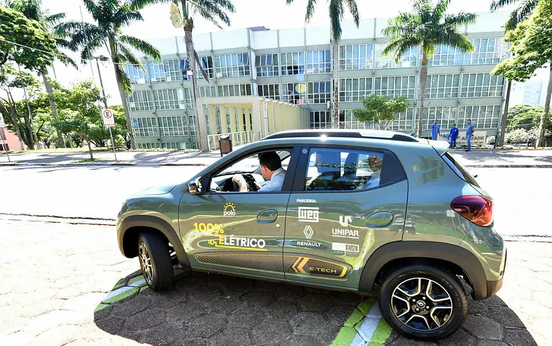 O prefeito realizou um ‘test drive’ em um modelo Kwid 100% elétrico, da Renault, com autonomia de 200 km e tempo de três horas para uma recarga completa, ao lado do engenheiro eletricista Samir El Halabi e do representante comercial Júnior Martins. A empresa, que tem sede em Araçatuba (SP), conta com filial em Umuarama e comercializa estações de recarga.